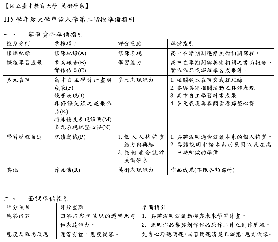 國立臺中教育大學 美術學系 115學年度個人申請書面審查資料準備指引